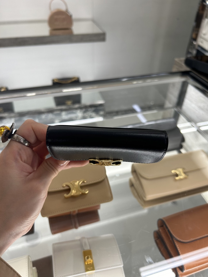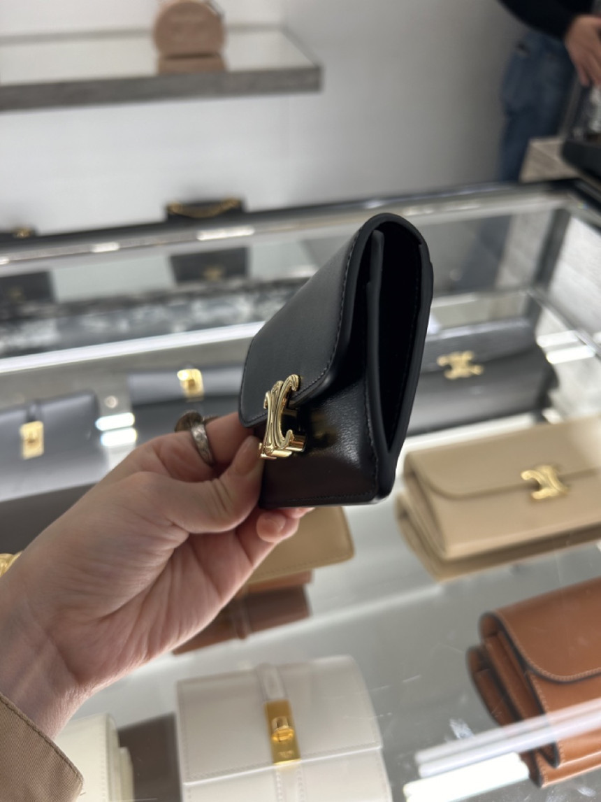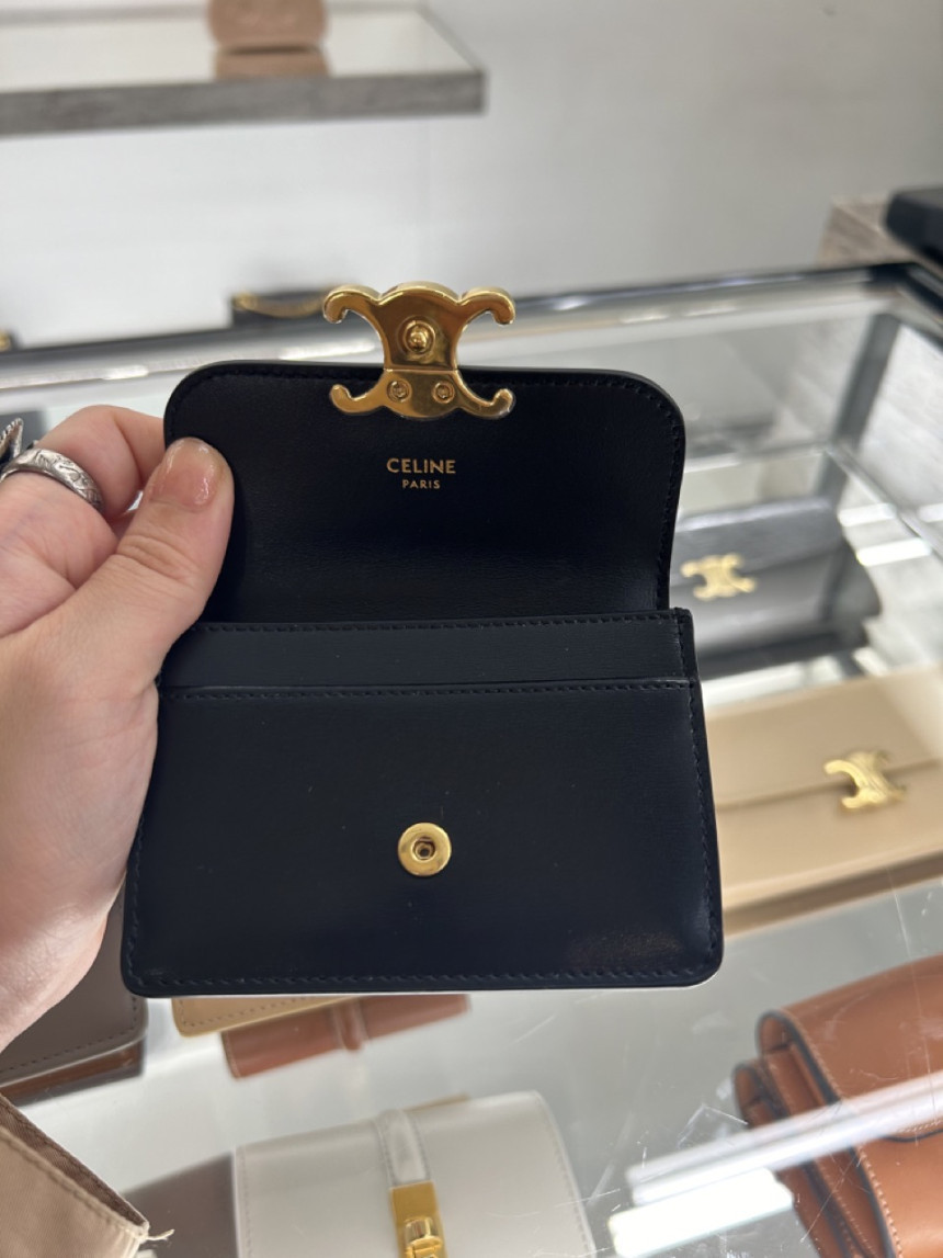 Celine Triomphe翻蓋卡片套以深邃黑色詮釋低調優雅, Triomphe金屬釘扣開關增添經典氣息, 輕巧設計成為您日常與夜間的完美隨身配搭 |