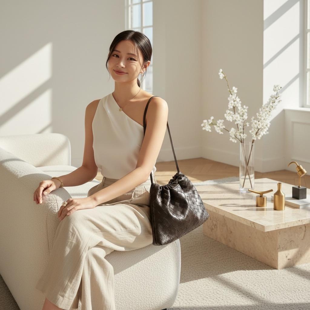 Bottega Veneta 抽繩福袋包採用品牌標誌性編織小牛皮製作,
