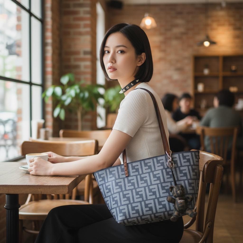 Fendi 8BH424 Roll 小款雙面 FF 緹花托特手提包 牛仔藍