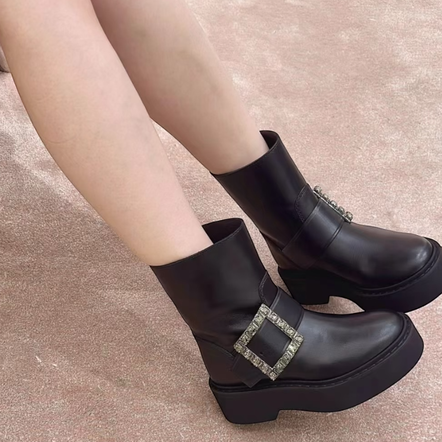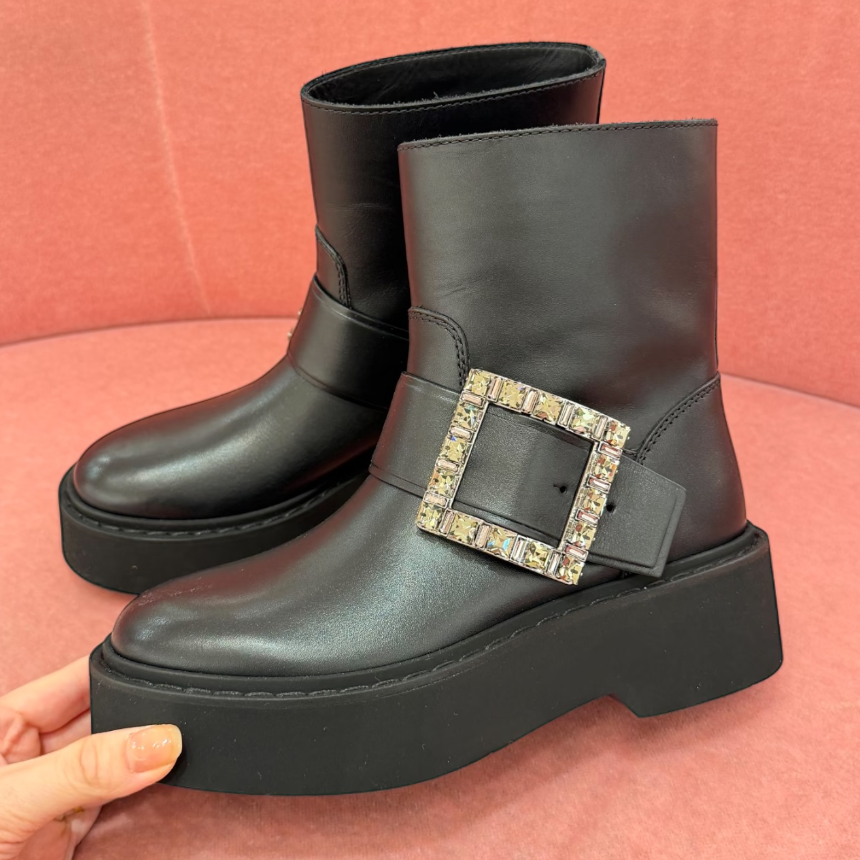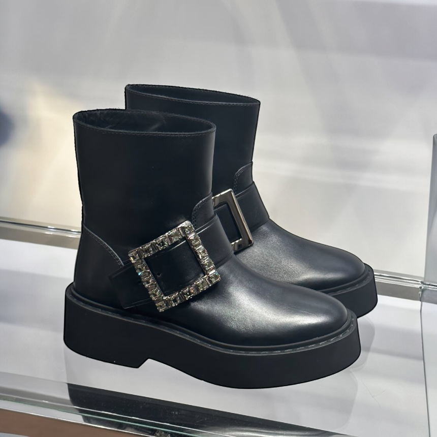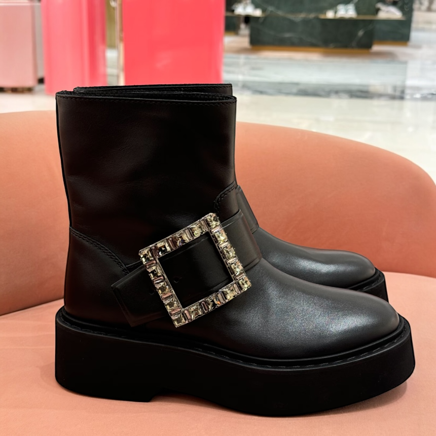 Roger Vivier Viv' Rangers水晶方釦短筒黑色皮靴 EU36/37/39/40