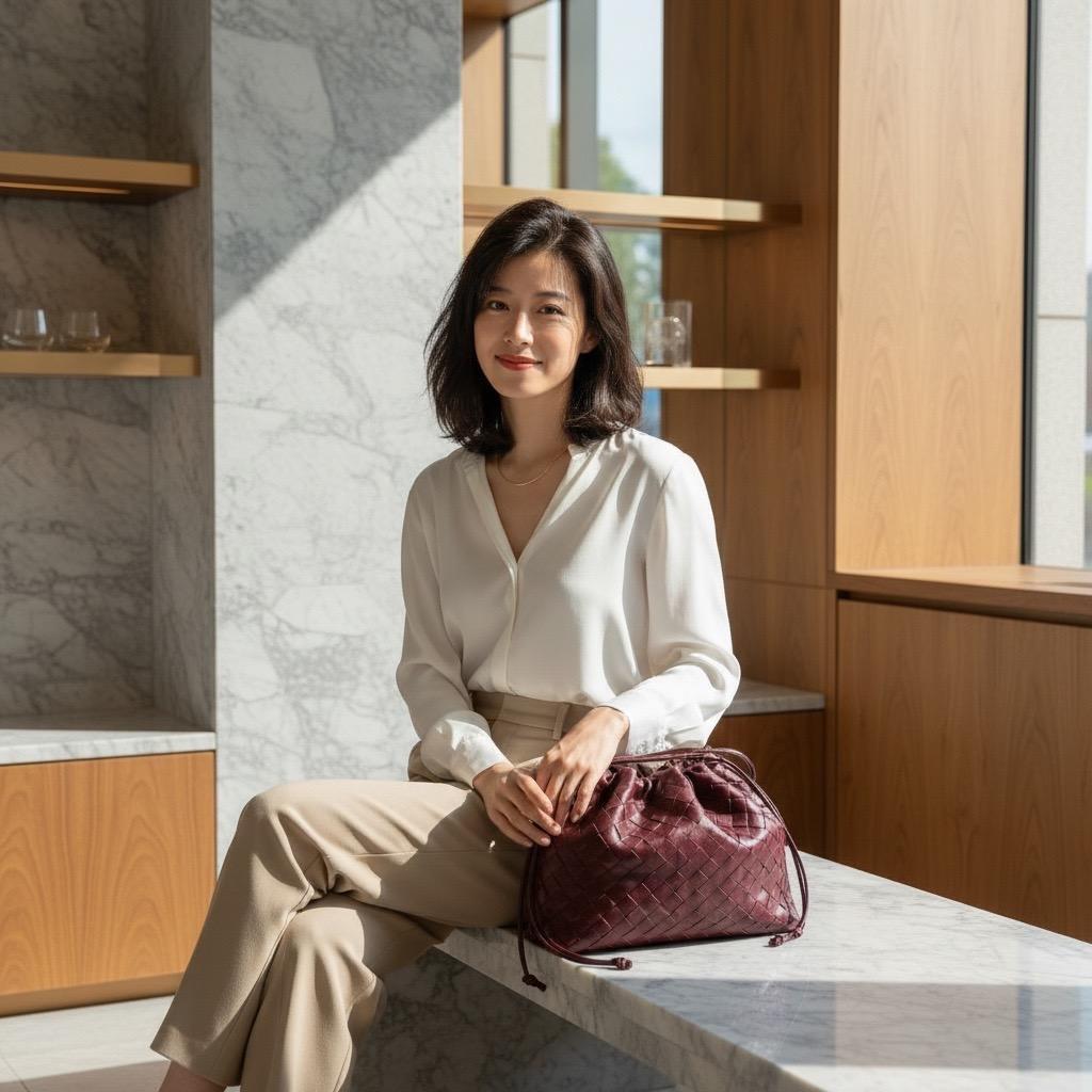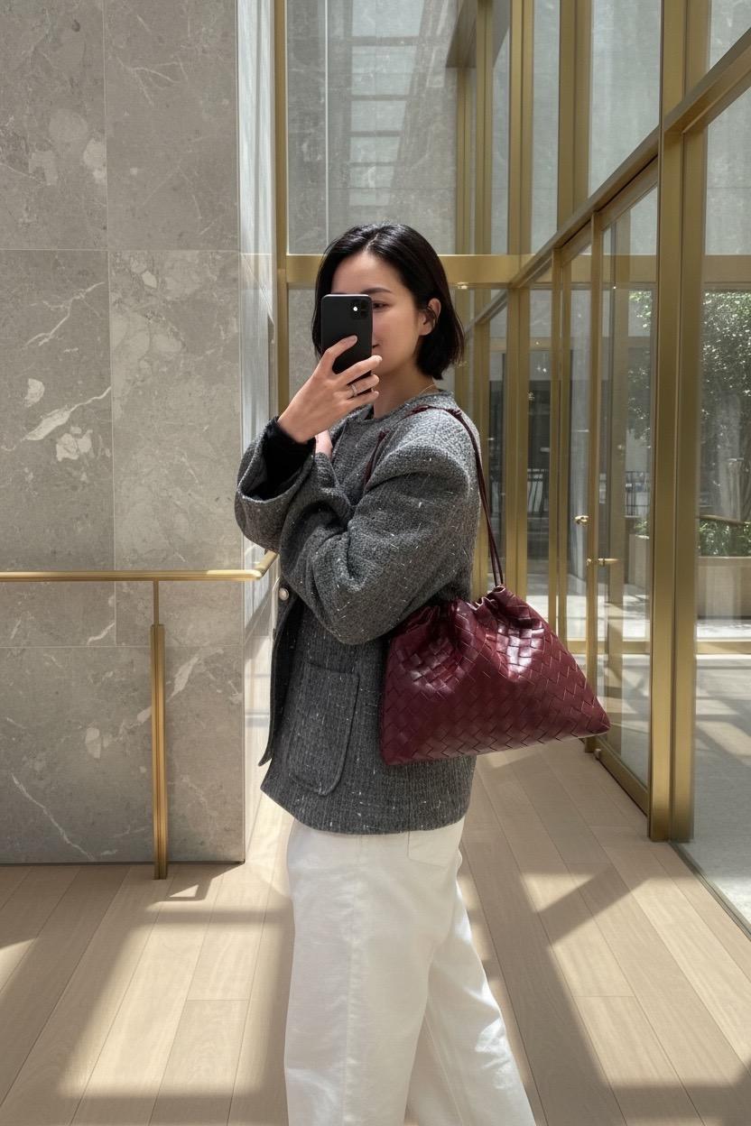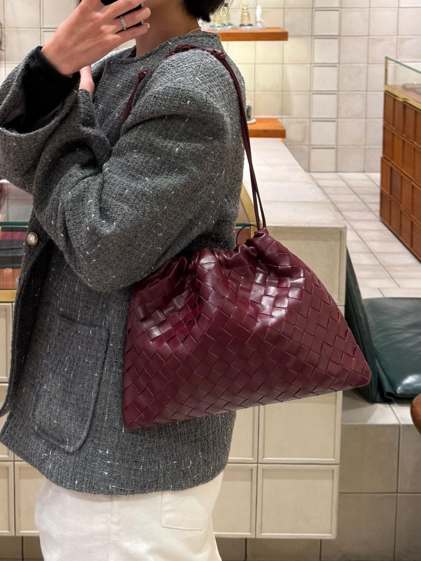 Bottega Veneta 抽繩福袋包採用品牌標誌性編織小牛皮製作,