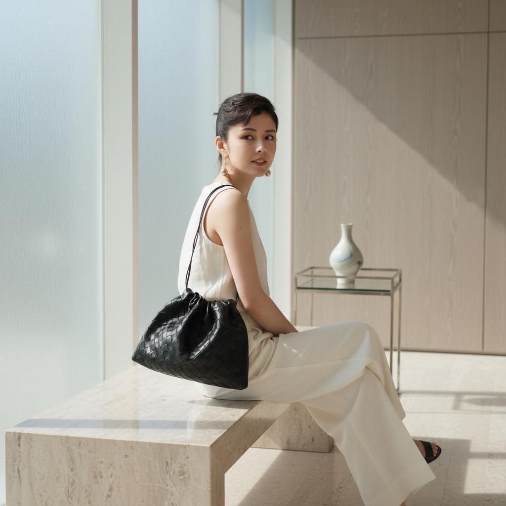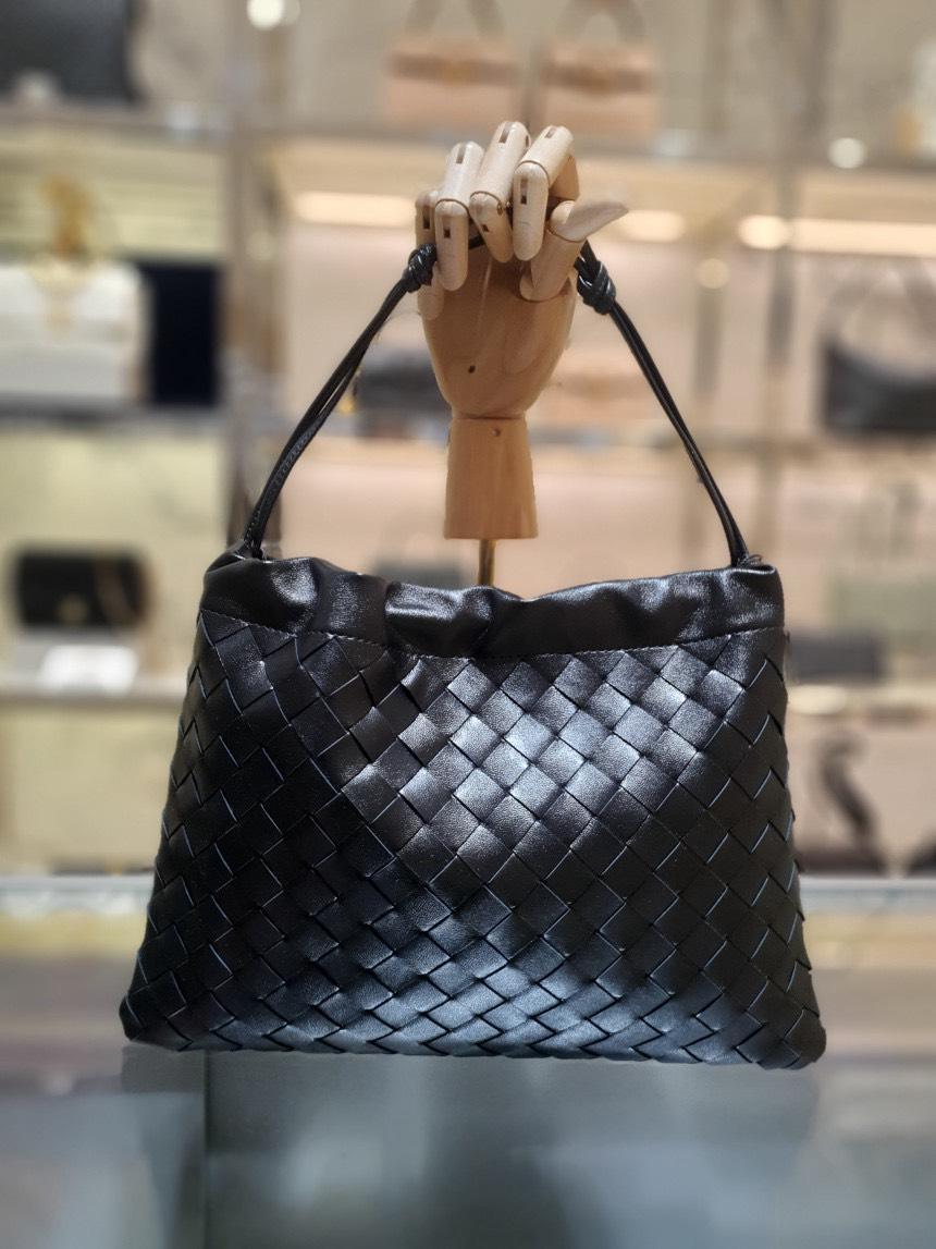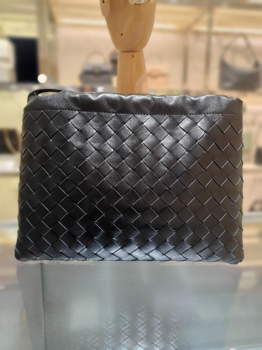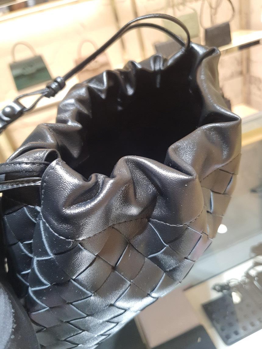 Bottega Veneta 抽繩福袋包採用品牌標誌性編織小牛皮製作,