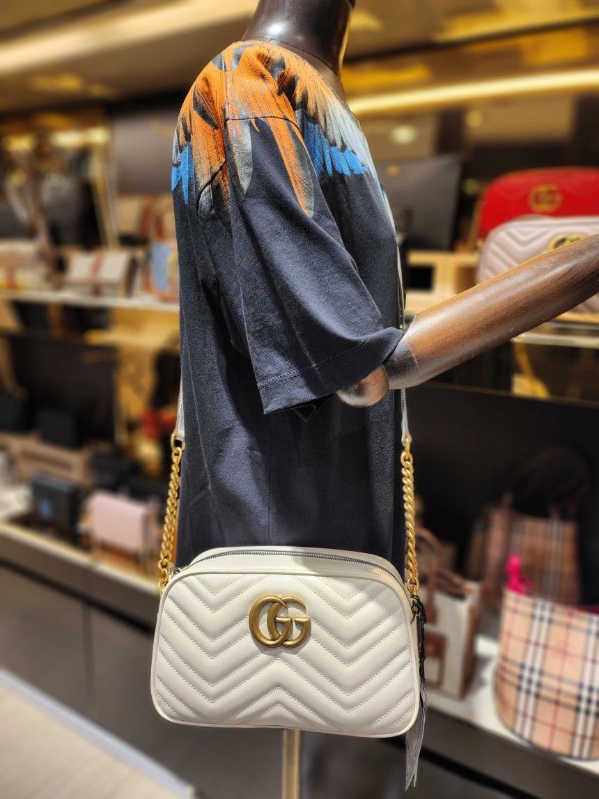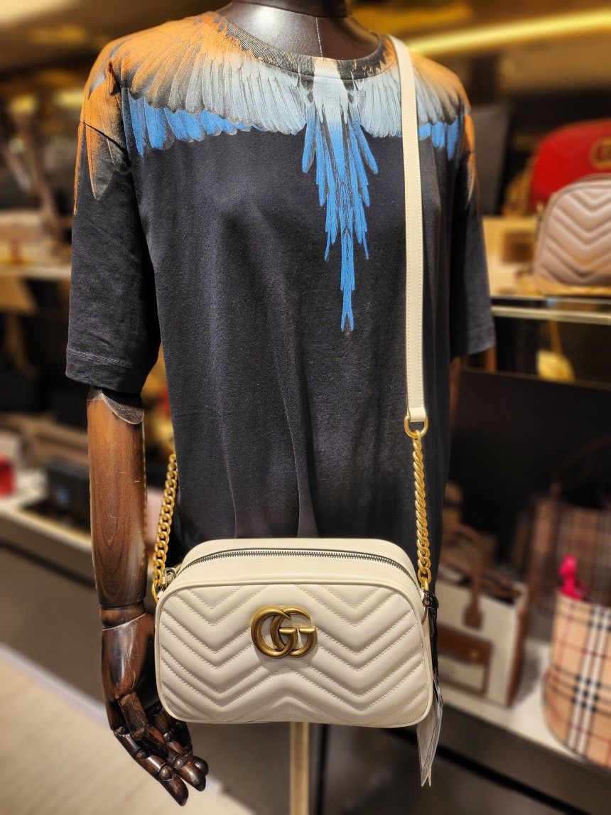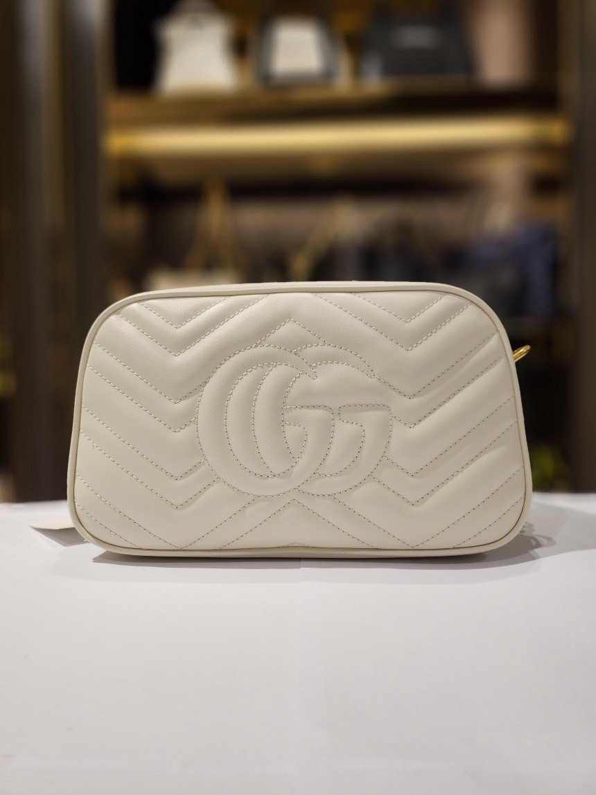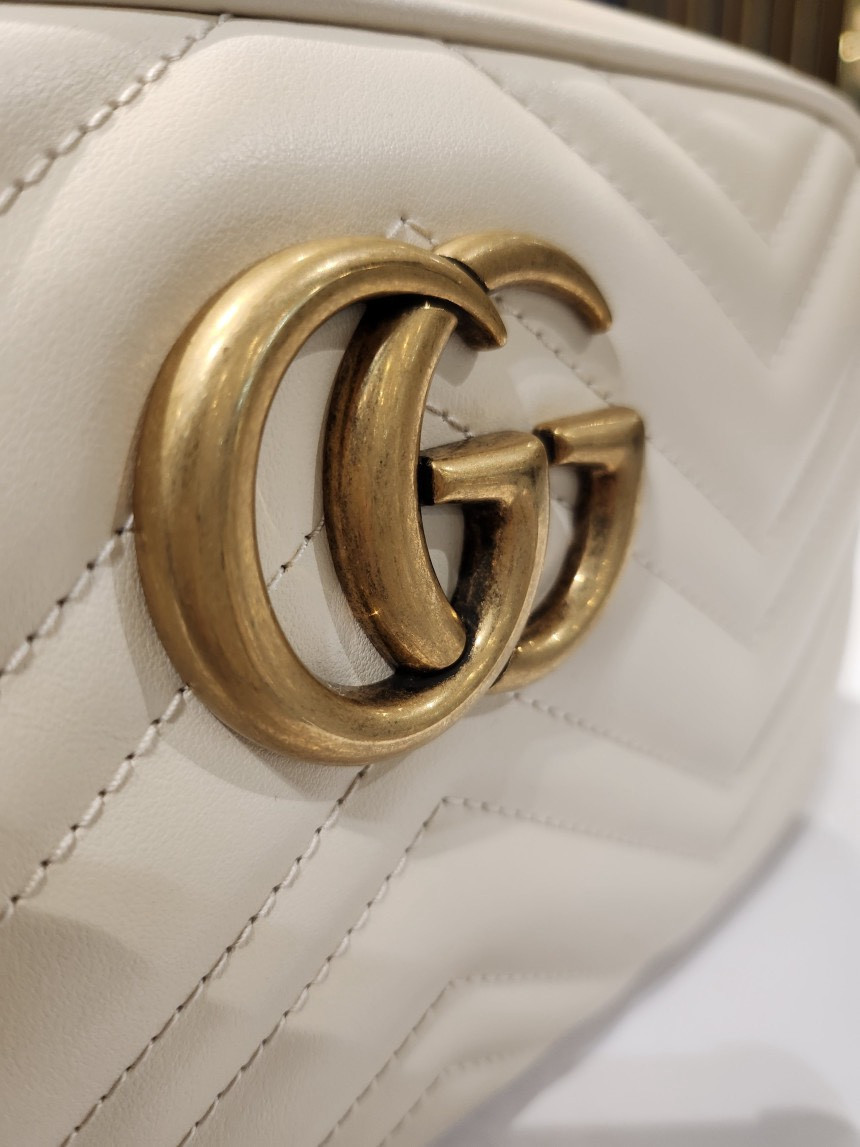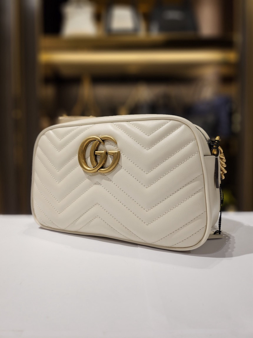 Gucci 447632 GG Marmont 小牛皮中款山型紋相機包 白色